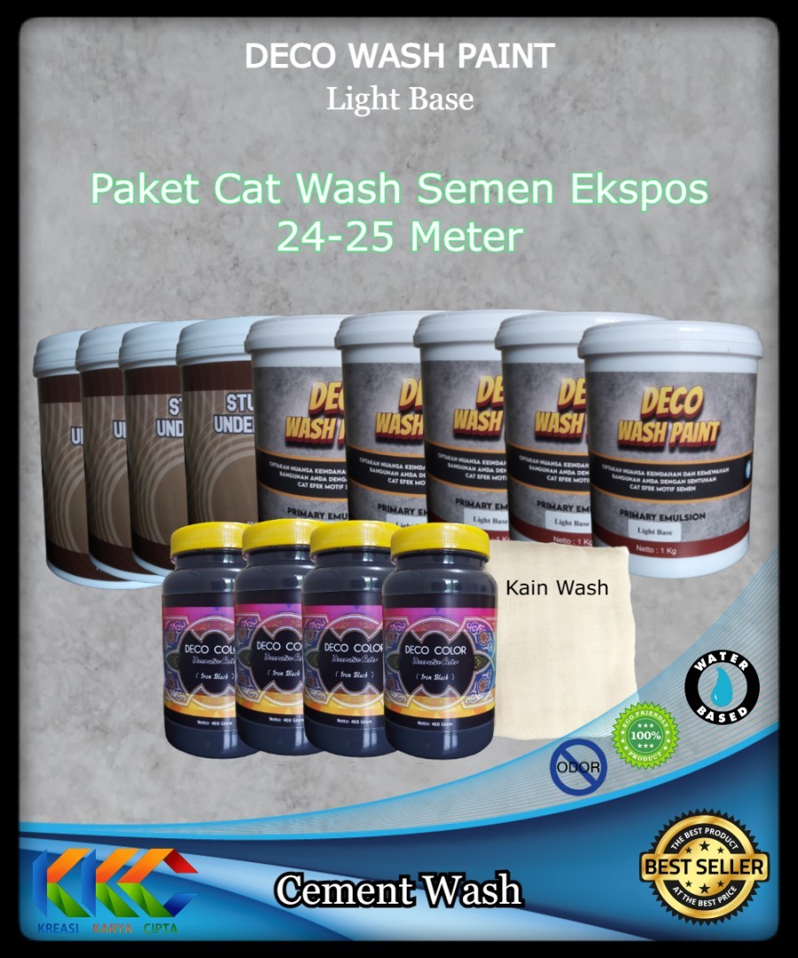 Paket Deco Wash Semen Ekspos Light Base 25 Meter adalah bahan-bahan cat dekoratif semen ekspos yang dijadikan 1 paket untuk kebutuhan dengan luas bidang 25 Meter Persegi.