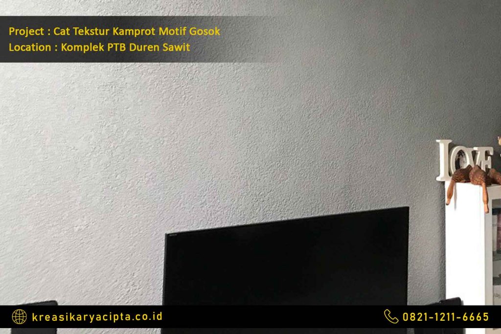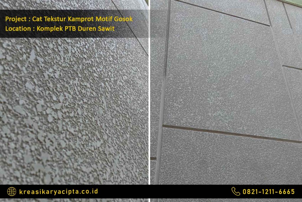 Cat dekoratif yang kami gunakan adalah cat yang kami produksi secara mandiri. Kami menjaga kualitas cat yang kami gunakan untuk setiap client kami. Cat dekoratif yang kami pakai ramah lingkungan dan tidak berbau. Client kami tidak hanya di jabodetabek. Cabang Kreasi Karya Cipta ada di beberapa kota besar di Indonesia. Berikut dokementasi Project Cat Tekstur Kamprot Motif Gosok Location Komplek PTB Duren Sawit.